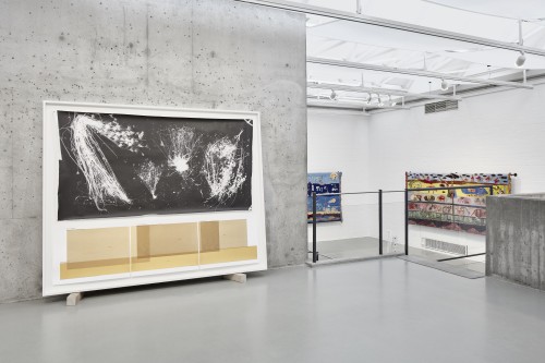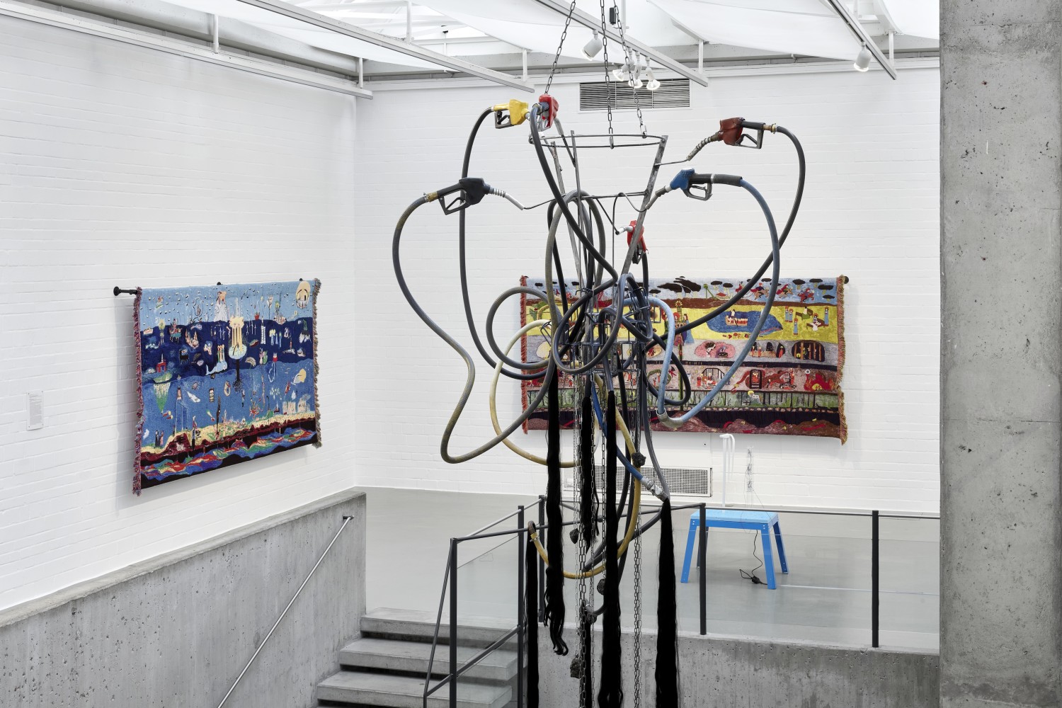 hinten: Miriam Sentler, links: Fossil Fuel Mnemosyne, 2022; rechts: Mining Myths, 2023, Wandteppiche aus Jacquard-Gewebe, Merinowolle und Baumwolle, jeweils 350 x 175 cm