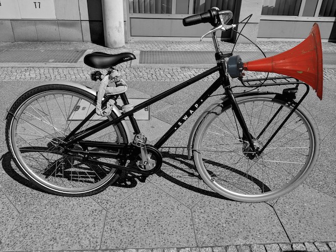 Der in Wilhelmshaven geborene Sound-Künstler Michael Rieken fährt mit seiner mobilen Klangskulptur Ludwig van Loop durch die Wilhelmshavener Innenstadt.