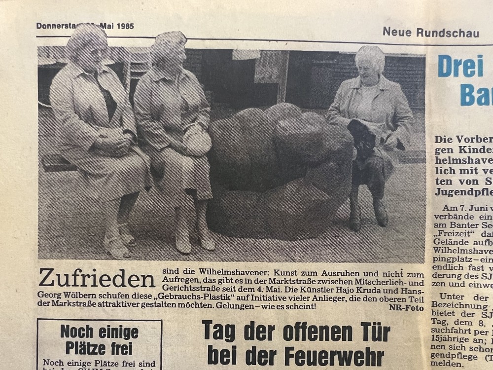 Zu den Sammlungen der Stadt gehören auch die Skulpturen im Außenraum. Ob Denk- und Mahnmale, ob Brunnen, Windspiele oder Kunst am Bau, Wilhelmshaven hat sich im Laufe der Zeit mit einer Vielfalt an Außenskulpturen unterschiedliche Gesichter gegeben. Der Rundgang startet an der Kunsthalle Wilhelmshaven: Direkt vor der Kunsthalle befindet sich mit „Seemannsgarn“ eine stattliche Plastik von Leonard Wübbena. Dahinter erstreckt sich das Betonrelief von Siegfried Pagel und auch im Garten gibt es Kunstwerke zu entdecken. Hartmut Wiesner, der viele Arbeiten im Stadtraum gestaltete, ist seit 2012 mit dem erhöhten Skulpturenensemble „Hol über“ im Parkgarten der Spar & Bau vertreten. Unweit davon verharrt der überdimensionale Bocciaspieler von Michael Schwarze im Wurf, und auch der Brunnen von Brigitte Stamm ist nicht weit weg. Die „Faust“ in der Marktstraße bildet den Abschluss des Rundgangs. Sie wurde von Hajo Kruda und Pico Wölbern geschaffen und konnte auf Betreiben von Christa Marxfeld-Paluszak aufgestellt werden.