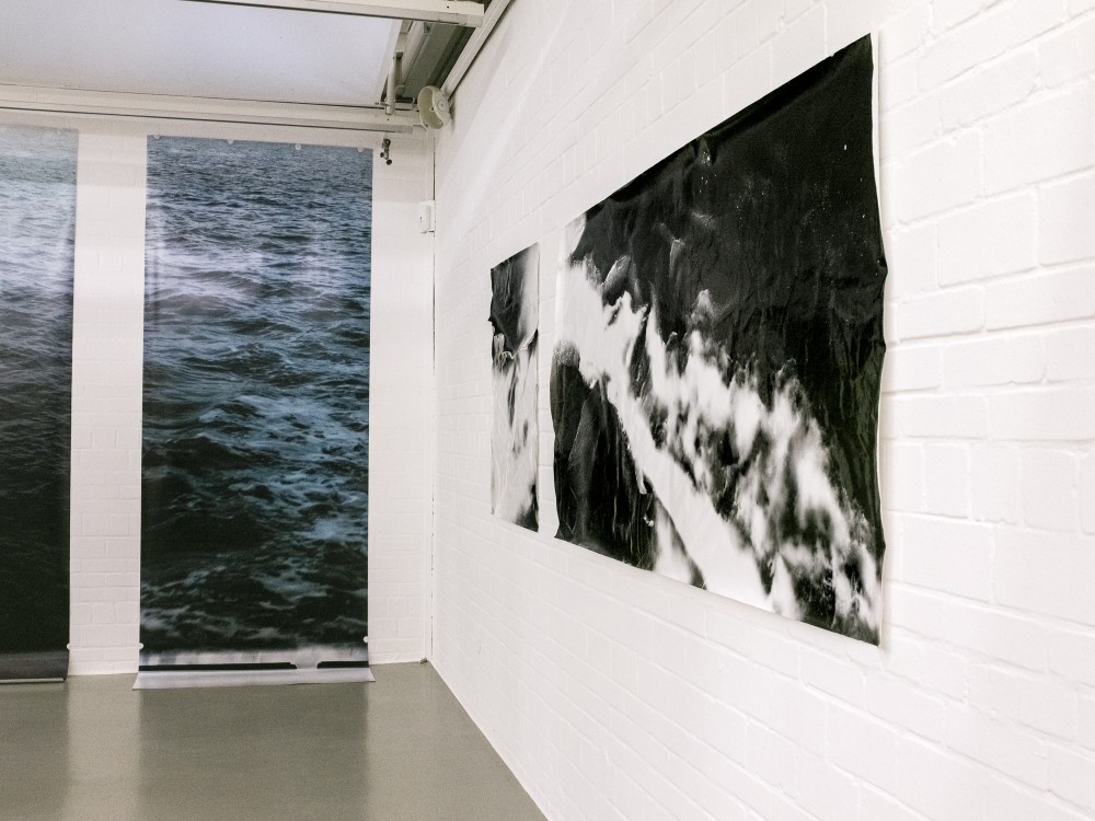 Ausstellungsansicht, Simon Ringelhan Zwischen Erregung und Benommenheit TT1, 2019, 3 C-Prints, je 127 x 375 cm Zwischen Erregung und Benommenheit TT2, 2021, Fotogramm auf Barytpapier, Größe variabel Foto: Simon Ringelhan