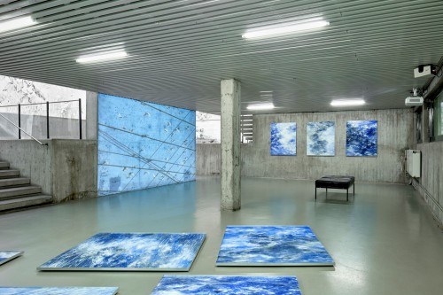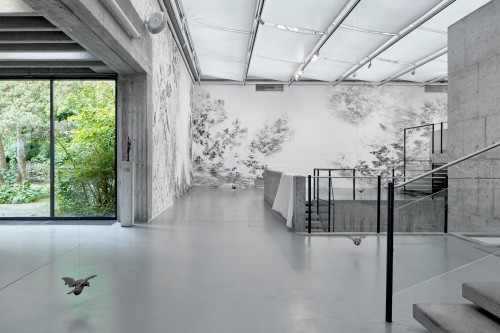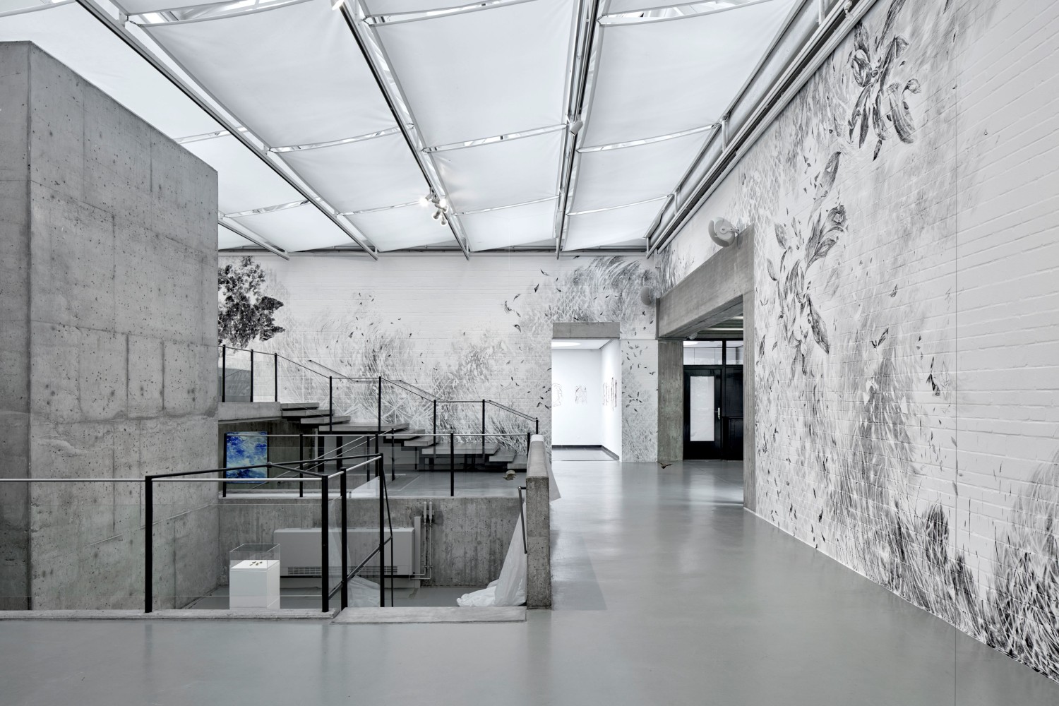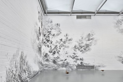 Flying Change – this is the title under which Swiss artist Julia Steiner will transform the open architecture of the Kunsthalle Wilhelmshaven with a spacious, aerial drawing into an organic, moving ambience; a pictorial space that can be experienced in a new way. The transformation of the white walls with brush and black gouache paint takes place over several weeks, but will not be lasting. The artist’s central focus is the fleeting existence of nature, animals and human beings, which shows itself in small, often intangible things (clouds, grass, water, birds). In addition to her site-specific work, Julia Steiner will present new groups of works, such as the gouaches from her series into the blue, which oscillate between sky and ocean. Her whispering system which is constructed from delicate grasses that are woven into object-like drawings and then plated with copper, can also be experienced. Another work is an expansive black glove: lost glove is a reference to the artist's main tool, the hand. With circulation and sound of now (hemispheres), Julia Steiner presents experimental and performative video works for the first time. A limited edition of unique bronze objects will accompany the show.