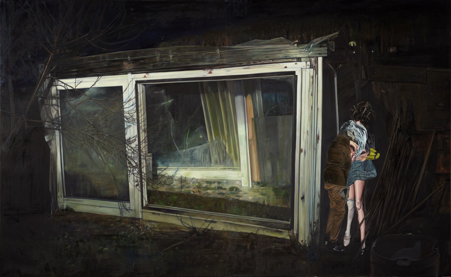 Ein Schauspiel der anderen Art beobachten wir in der Malerei des Schweizer Künstlers Léopold Rabus: Vor naturalistisch dargestellten Landschaften sehen wir seltsame, verrückte oder schicksalhaft in ihre Umgebung versponnene Wesen, die aber immer auch einen tiefgründigen, schwarzen Humor andeuten. Die unspektakulären Orte des Verfallenen und Vergessenen sucht Rabus (geb. 1977) gleich bei sich zuhause in Neuchâtel um die Ecke auf, während andere Kunstschaffende ihre Erfüllung in den Metropolen der Welt suchen und immer entferntere Destinationen ansteuern. Die Landschaft wird in seinen Monumentalgemälden zur Bühne, auf der sich paradoxe menschliche Konstellationen entwickeln und bizarre Dramen abspielen.