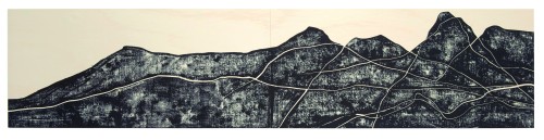 o.T., 2015, Linolschnitt auf Holz, zweiteilig, 72 x 320 cm