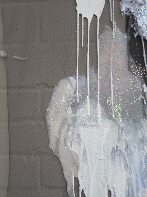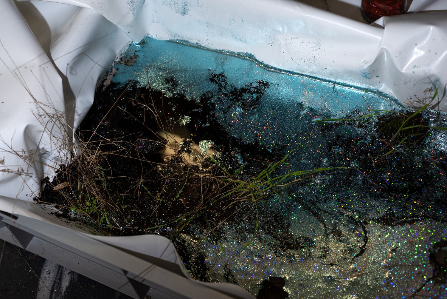 Liza Dieckwischs WHEN CAKE GLAZE SHINES PERFECTLY verwandelt die Kunsthalle mit großformatigen Arbeiten aus Latex und Silikon in Kombination mit einem Teppich und einem Glitzersee in ein außergewöhnlichen grau-blaues Environment.