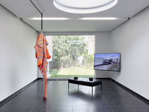 vorne links: Sonja Hornung, Sperre 1C, 2024, Installation mit handgenähtem Ganzkörperanzug und Schlagschutzhandschuh (synthetische Stoffe, Hi-Vis-Gewebe, Reißverschlüsse, Ösen, Elektroklebeband, Leder, Gewicht)