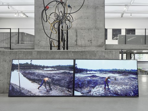 vorne: Ayọ̀ Akínwándé, Ogoni Cleanup, 2020, 2-kanalige Videoperformance, Farbe und Ton, 3:44 min, Still, Courtesy the artist