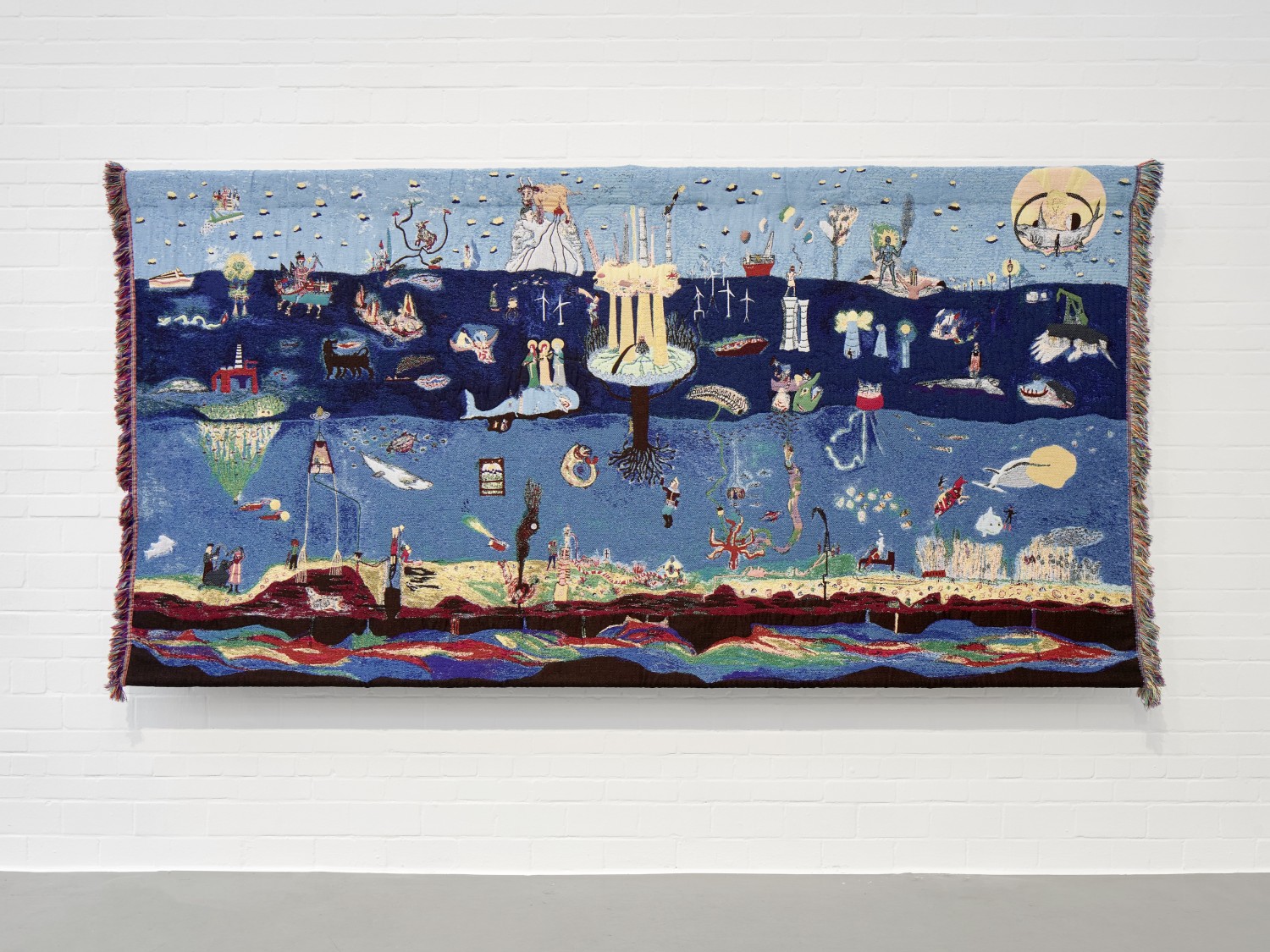 hinten: Miriam Sentler, links: Fossil Fuel Mnemosyne, 2022; rechts: Mining Myths, 2023, Wandteppiche aus Jacquard-Gewebe, Merinowolle und Baumwolle, jeweils 350 x 175 cm