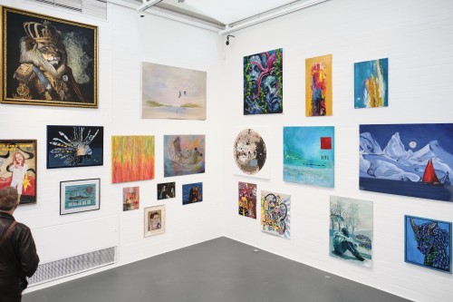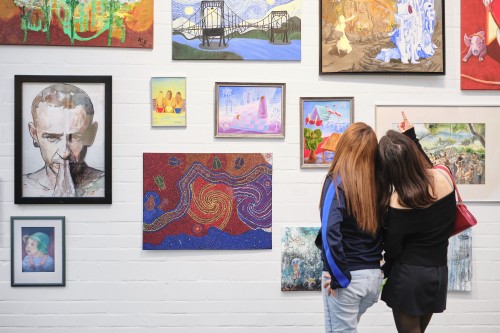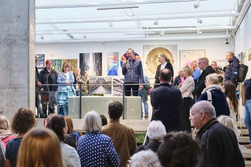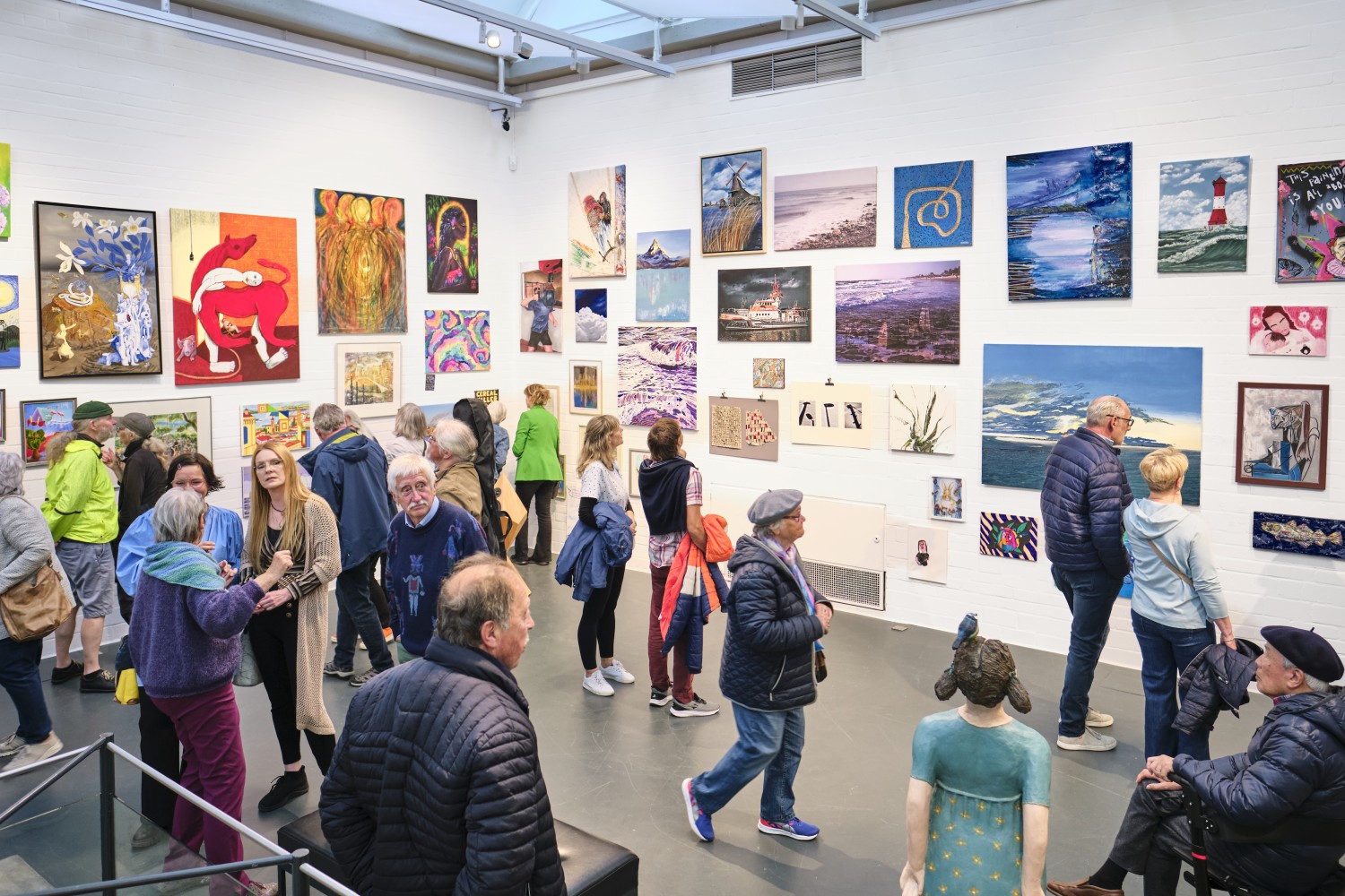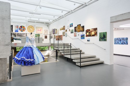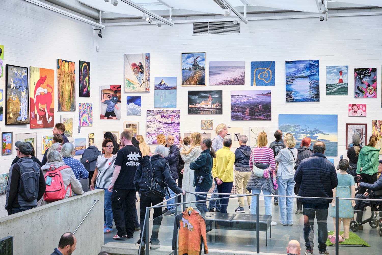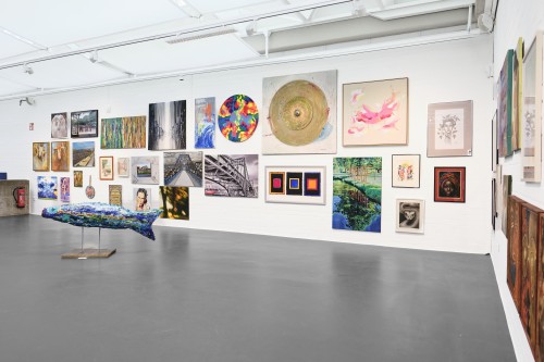 Alle Ausstellungsbesucher*innen können anhand kleiner Klebepunkte ihren Favoriten wählen. Am Sonntag werden dann um 17 Uhr die Gewinnerwerke bekanntgegeben.