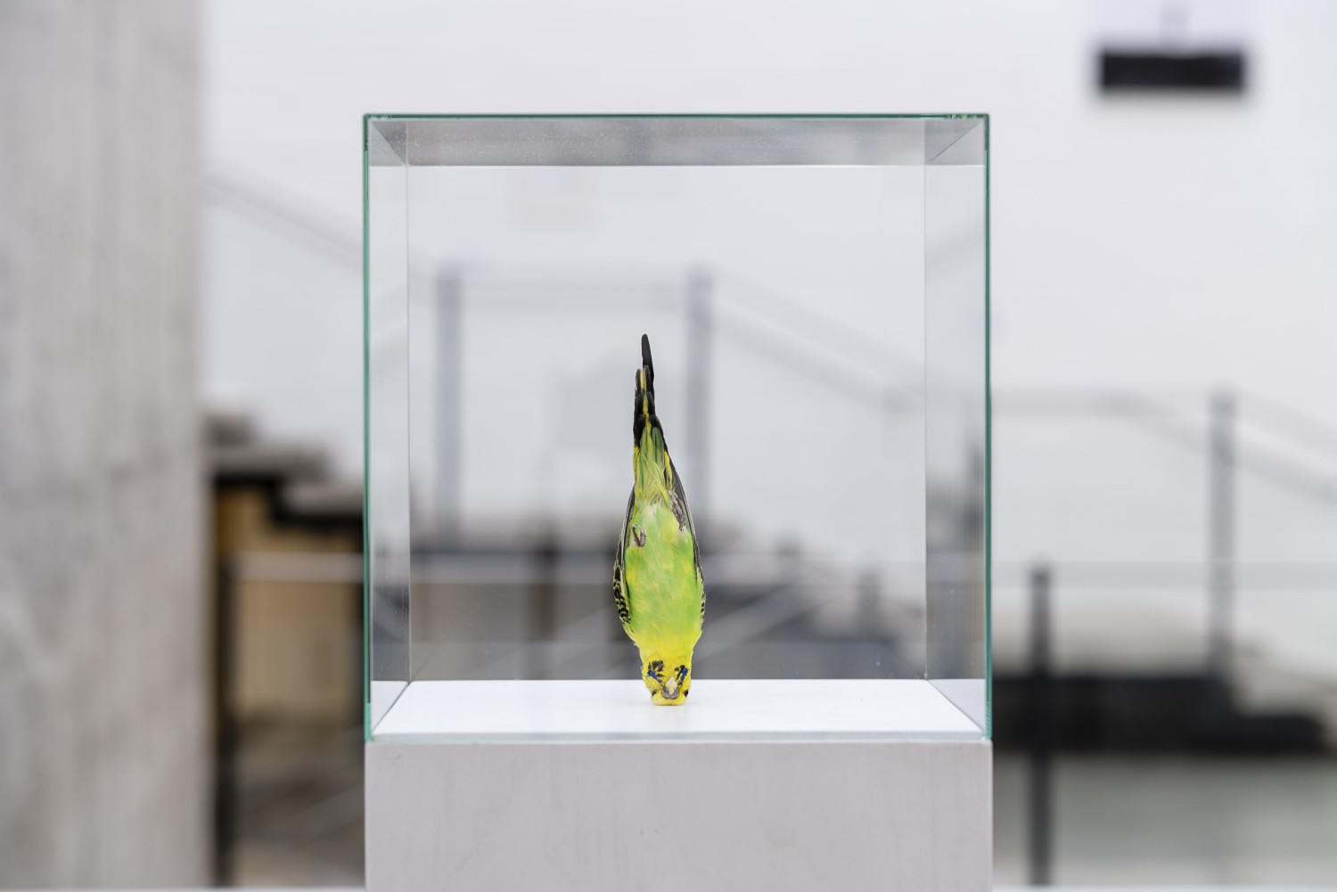 Vogel präpariert (grün-gelb), Sockel, Glashaube, Glasboden, Edition 3 + 2 AP, 160 x 30 x 30 cm