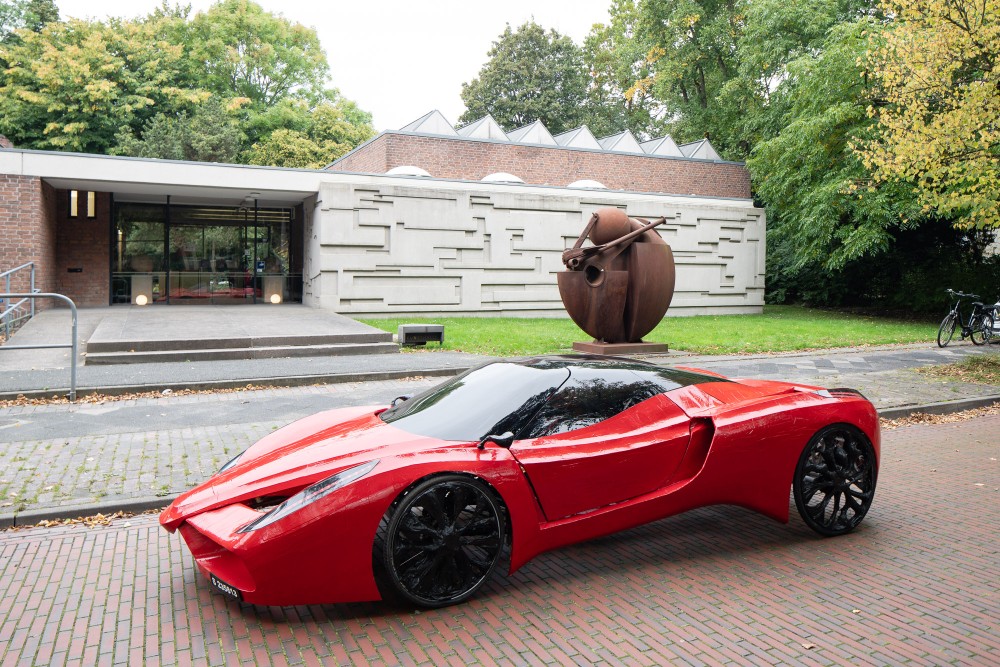 Nullemission trifft auf pure Eleganz. Als Vorbote der Ausstellung "Cyclophilia" (2022) dreht Hannes Langeders Fahrradi, der langsamste Sportwagen der Welt, seine Runden durch die Adalbertstraße.