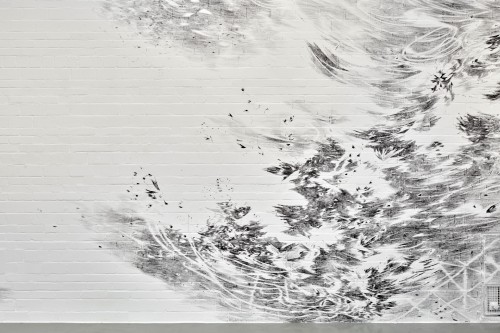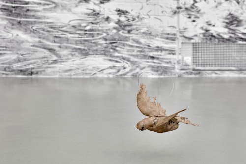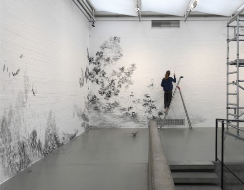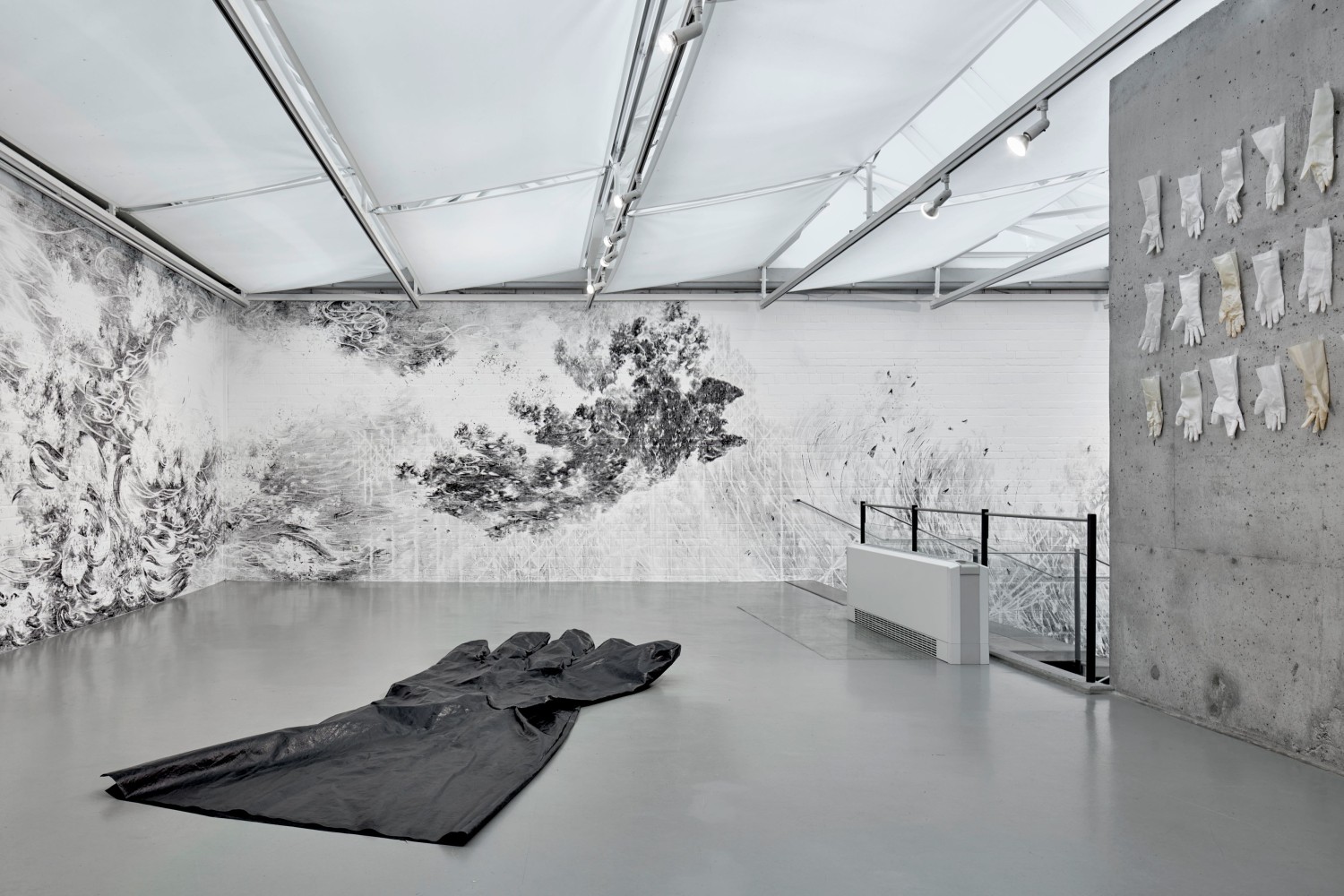 Flying Change – this is the title under which Swiss artist Julia Steiner will transform the open architecture of the Kunsthalle Wilhelmshaven with a spacious, aerial drawing into an organic, moving ambience; a pictorial space that can be experienced in a new way. The transformation of the white walls with brush and black gouache paint takes place over several weeks, but will not be lasting. The artist’s central focus is the fleeting existence of nature, animals and human beings, which shows itself in small, often intangible things (clouds, grass, water, birds). In addition to her site-specific work, Julia Steiner will present new groups of works, such as the gouaches from her series into the blue, which oscillate between sky and ocean. Her whispering system which is constructed from delicate grasses that are woven into object-like drawings and then plated with copper, can also be experienced. Another work is an expansive black glove: lost glove is a reference to the artist's main tool, the hand. With circulation and sound of now (hemispheres), Julia Steiner presents experimental and performative video works for the first time. A limited edition of unique bronze objects will accompany the show.